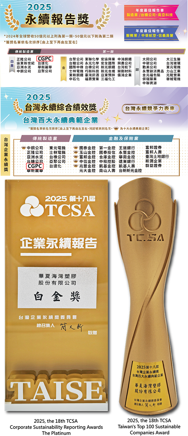 CGPC, upholding the spirit of “Creating Sustainable Value and Advancing a Sustainable Society,” continues to integrate ESG thinking into its sustainability strategies and expand its positive societal impact. At the 18th TCSA Taiwan Corporate Sustainability Awards, the Company distinguished itself by receiving two major awards, underscoring its steady progress and continued efforts in sustainability governance, information disclosure, and related initiatives.