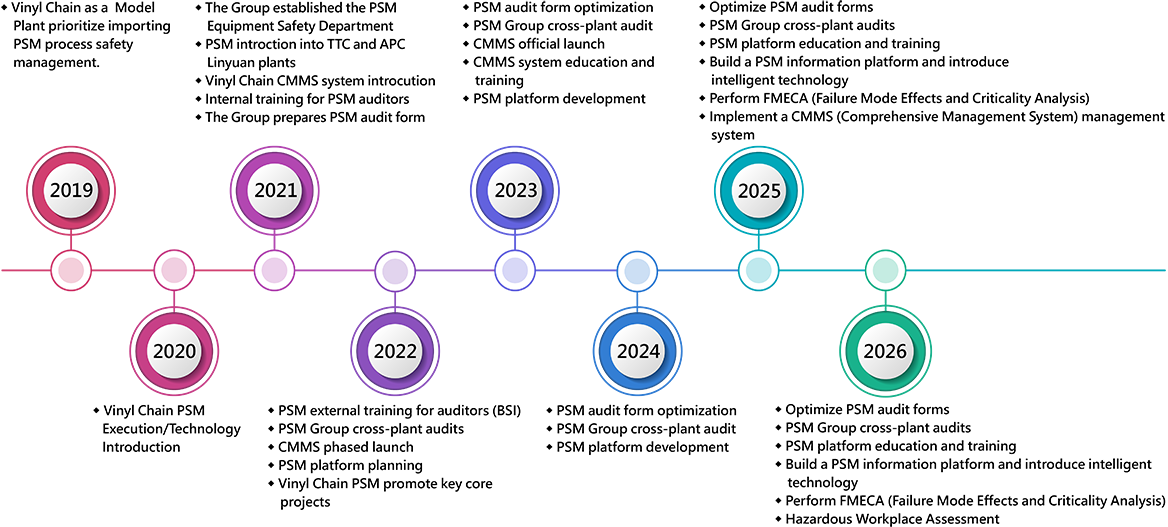Three plants in Vinyl Chain(CGPC, TVCM and CGPCP) implemented the PSM, and Chairman Han-Fu Lin of TVCM led all employees to participate and implement the project. Hired external consulting teams which adopted the industry-academia collaboration to help us implement the PSM project, including system establishment, technological methods, etc., which was divided into four phases.