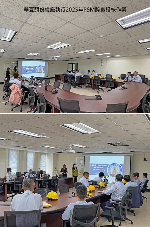 為持續強化製程安全管理(PSM)制度,台聚集團自2018年起積極推動各廠區PSM優化作業。為全面掌握各廠推動現況,並促進跨廠間的經驗交流與學習,集團於2025年10月20日由張芳瑜課長率領稽核團隊,前往華夏頭份總廠執行年度PSM跨廠稽核。