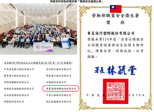 為深化職業安全與健康管理之落實,華夏公司積極於永續報告書中揭露職業健康與安全績效及精進作法,獲勞動部職業安全衛生署肯定,榮列