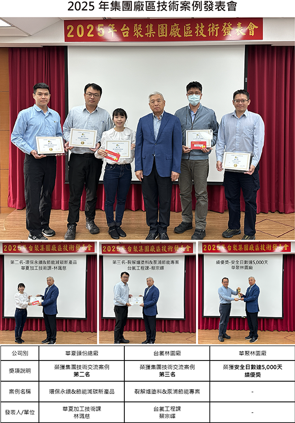 集團設環處於2025年10月28日舉辦「台聚集團廠區技術交流會」,由台灣12個廠區各提出1件以上技術案例,進行書面審查,最終由7件廠區案例進入決選。決選由集團高階主管、發表廠區代表共同投票評分,評選出本年度前三名績優技術案例,並依集團安全激勵辦法-各廠累積安全日數,由吳董事長親自頒發獎狀與獎金,以表彰團隊在技術改善與節能創新上的卓越表現,同時頒發安全日數激勵獎盃予以表揚及合影,以茲鼓勵。