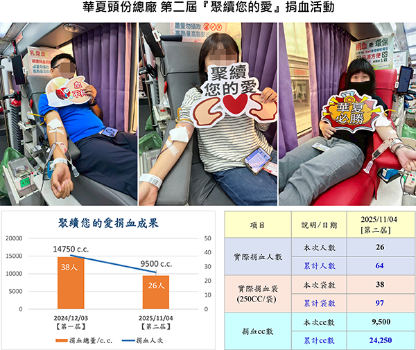 華夏公司將持續推動「聚續您的愛」系列活動,透過定期舉辦捐血與社會關懷行動,鼓勵同仁以實際行動關懷社會、守護生命,持續實踐企業的永續承諾。