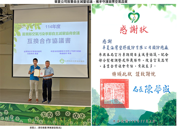 華夏公司積極響應苗栗縣環保局政策,於2025年11月簽署《空氣污染季節自主減量協議書》,並榮獲苗栗縣環保局沈副局長親頒感謝狀。根據協議,華夏公司將於2025年11月至2026年4月空氣污染高發季節期間,針對廢氣排放關鍵環節實施製程調整與降載運轉等優化管控,主動減少粒狀物、硫氧化物(SOx)及氮氧化物(NOx)排放。