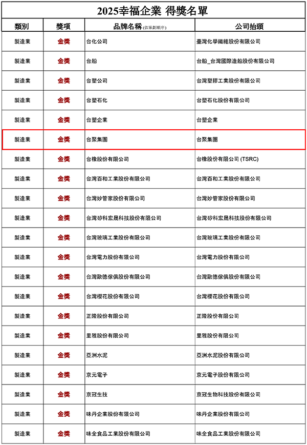 在2025年1111人力銀行「幸福企業」評選中,台聚管理顧問股份有限公司有完善的福利制度,從逾4000家參賽企業中脫穎而出,榮獲金獎,充分肯定了公司長期以來對員工福祉的重視。