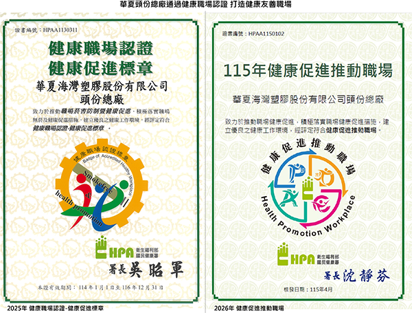 華夏頭份總廠長期重視員工健康,致力於營造安全且友善的職場環境。 於2026年4月,頭份總廠通過衛生福利部國民健康署評定,榮獲「2026年健康職場認證、健康職場認證標章(2025-01-01至2027-12-31)」。