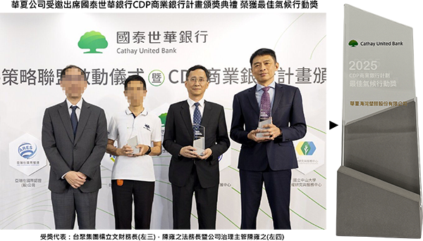 華夏公司受邀出席國泰世華銀行於2026年4月23日舉辦之「CDP商業銀行計畫頒獎典禮」,並由台聚集團法務長暨公司治理主管陳雍之代表受獎,榮獲「最佳氣候行動獎」,肯定公司在環境揭露與碳管理之推動成果。