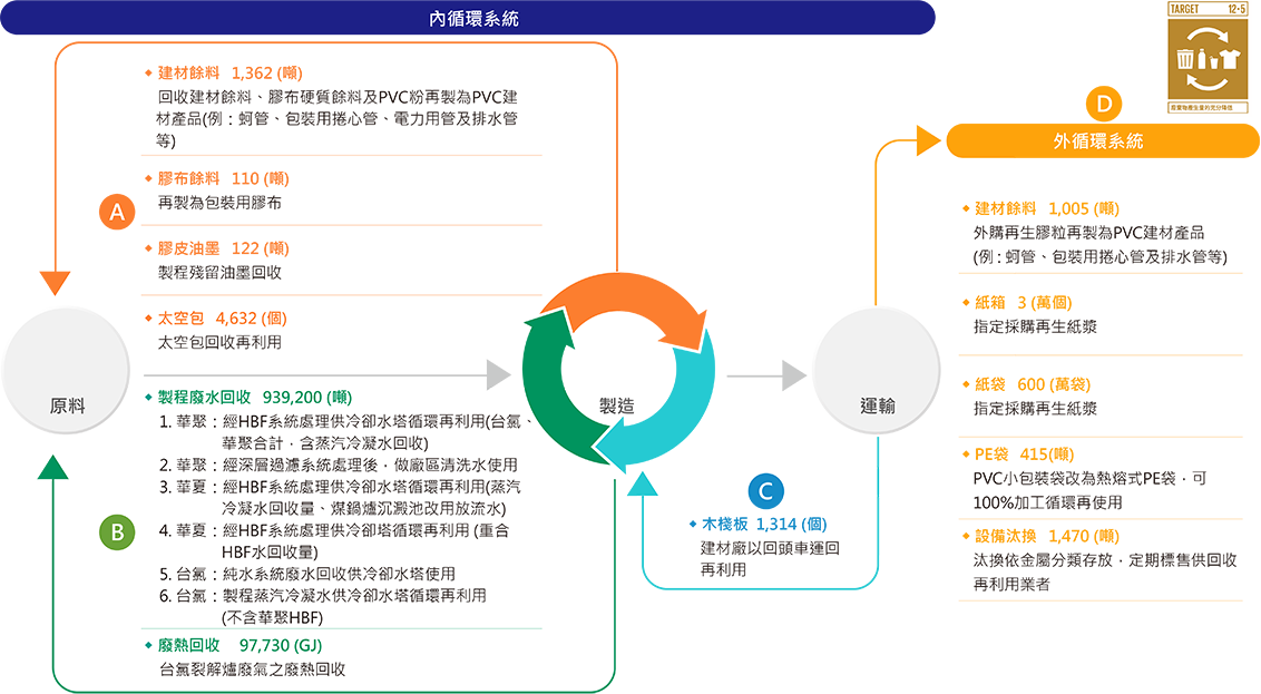 華夏建材製造部自2020年開始蒐集各項廠內循環再生回收料和回收PVC粉,及外購再生膠粒,投入生產再製成新品銷售,累計至2024年回收數量約11,948噸,2024年回收再利用率達14.5%。