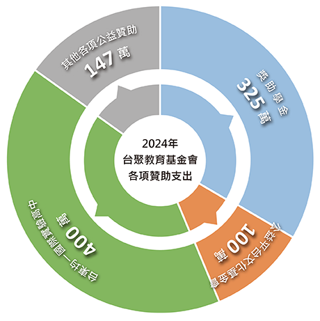 2024年台聚教育基金會各項公益贊助支出合計為972萬元,其中包含頒發獎助學金325 萬元;贊助公益平台文化基金會100 萬元及臺東均一國際實驗高中400 萬元;其他各項公益贊助支出147 萬元。