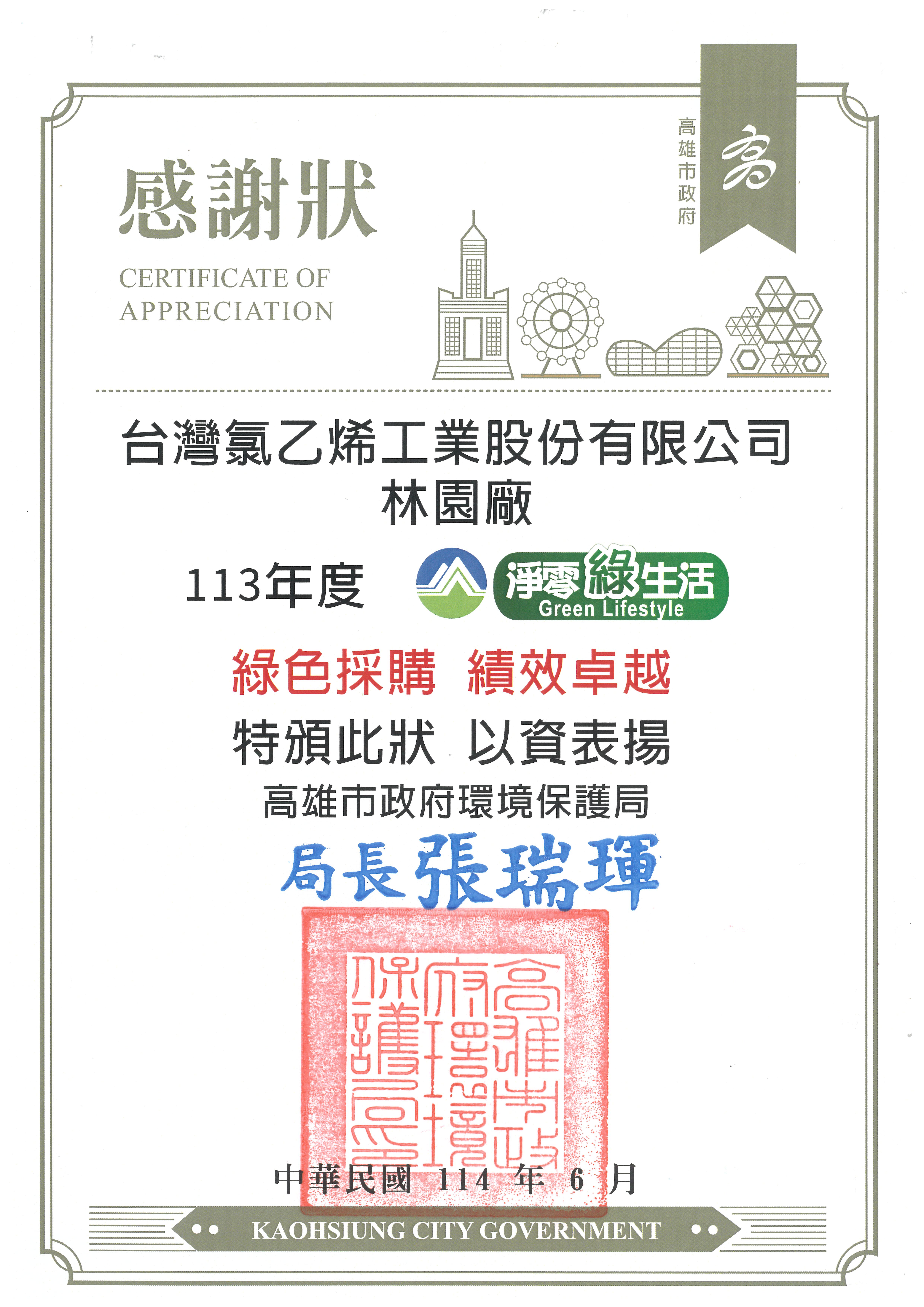 華夏、台氯榮獲「113年綠色採購」與「113年度淨零綠生活」績優企業感謝狀。